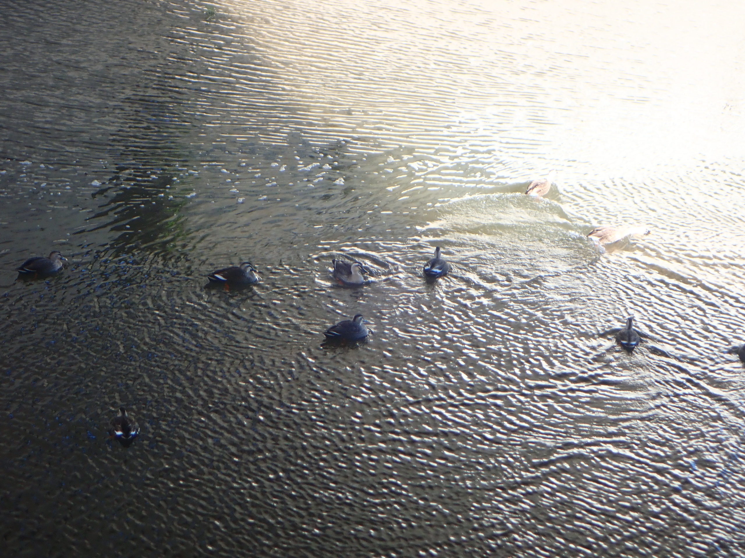 野川では鴨が楽しそうに水面を、泳いでいます。