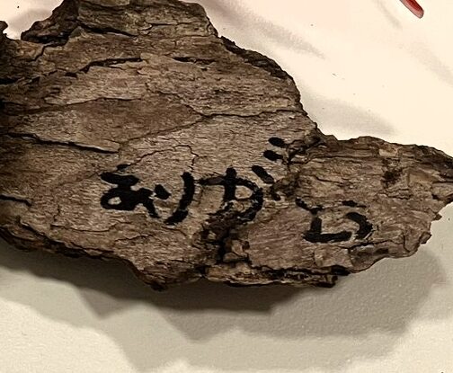 写真は、お礼の品として渡してくれた折り紙とクスノキの樹皮。