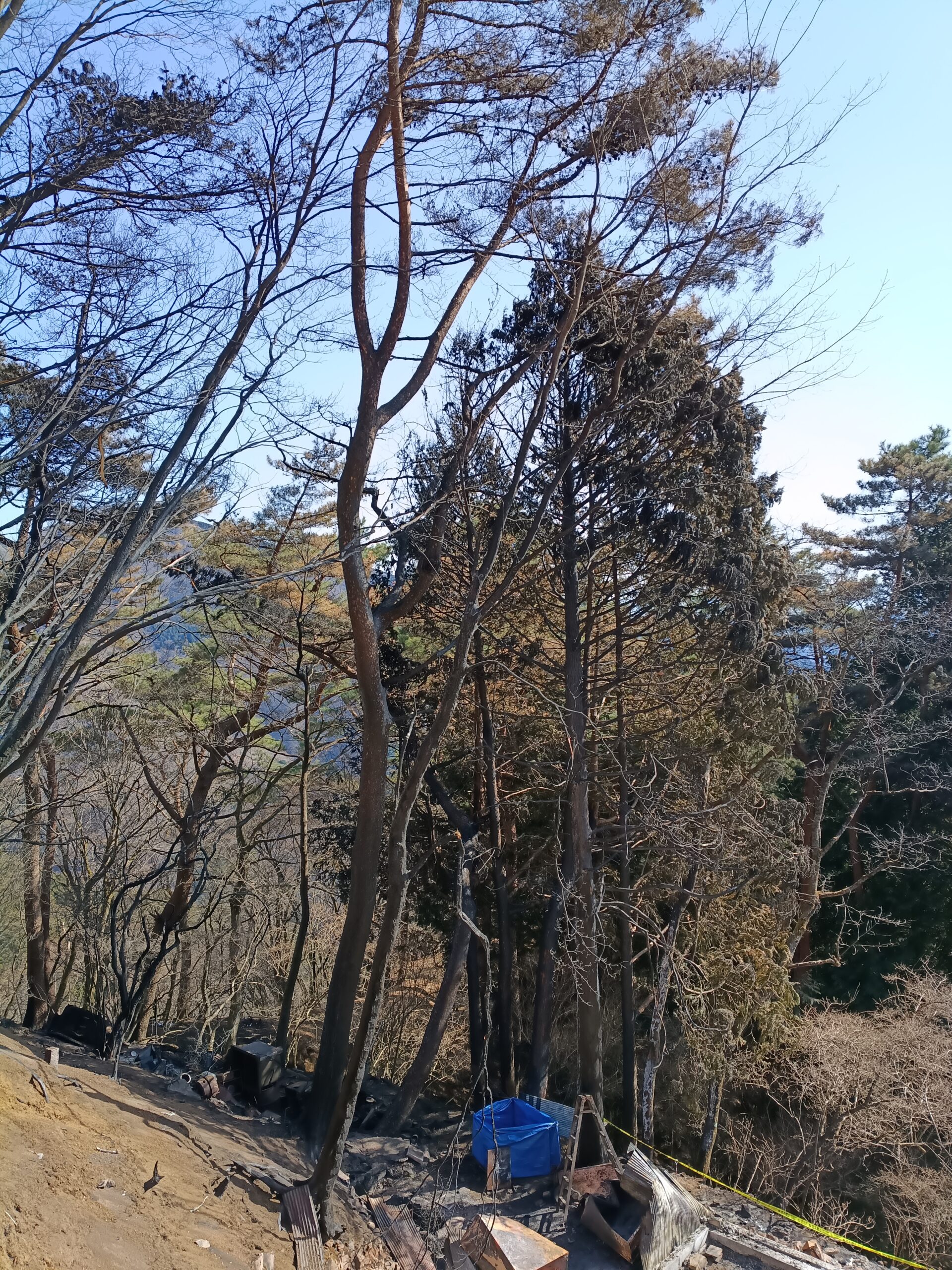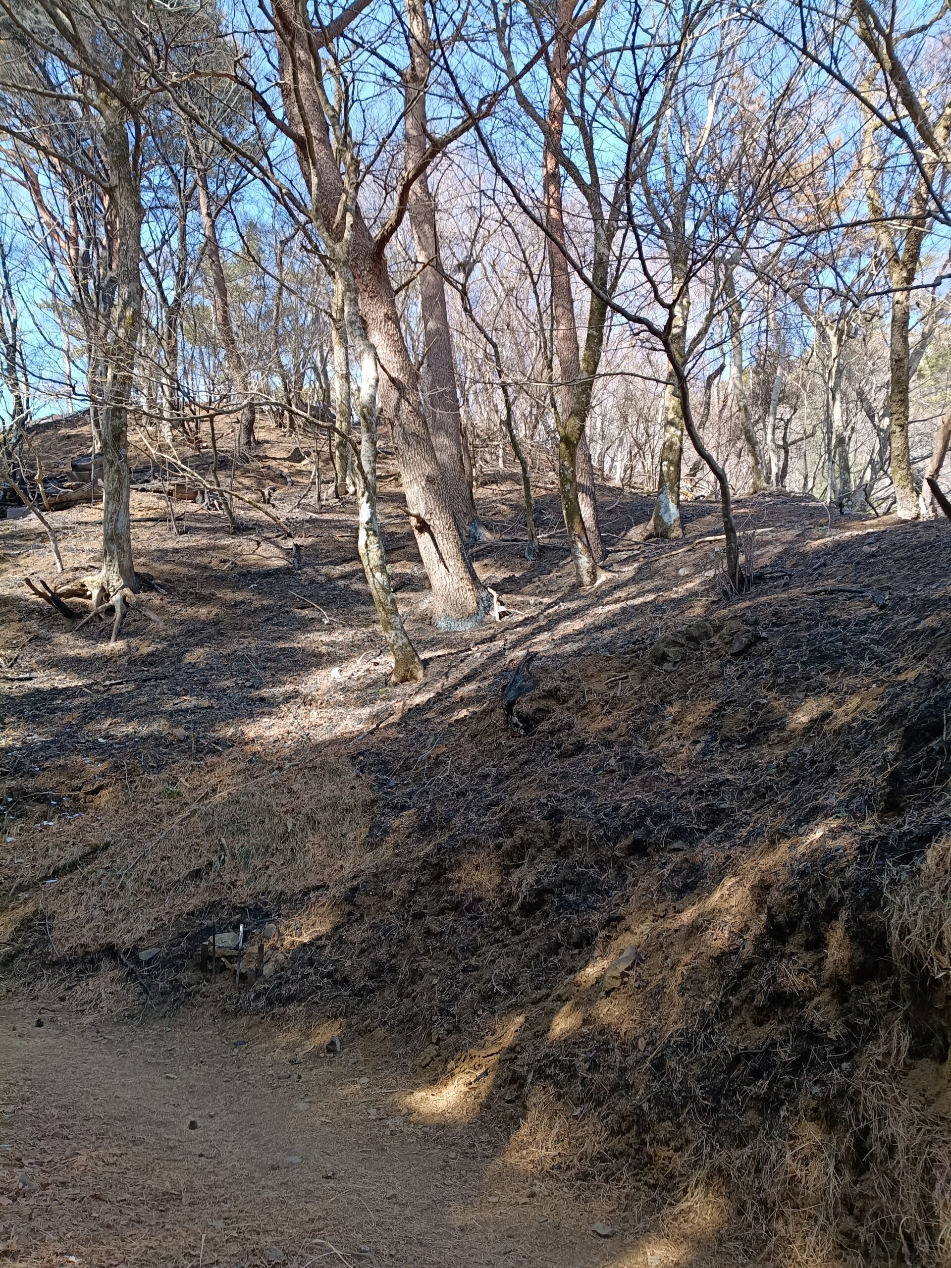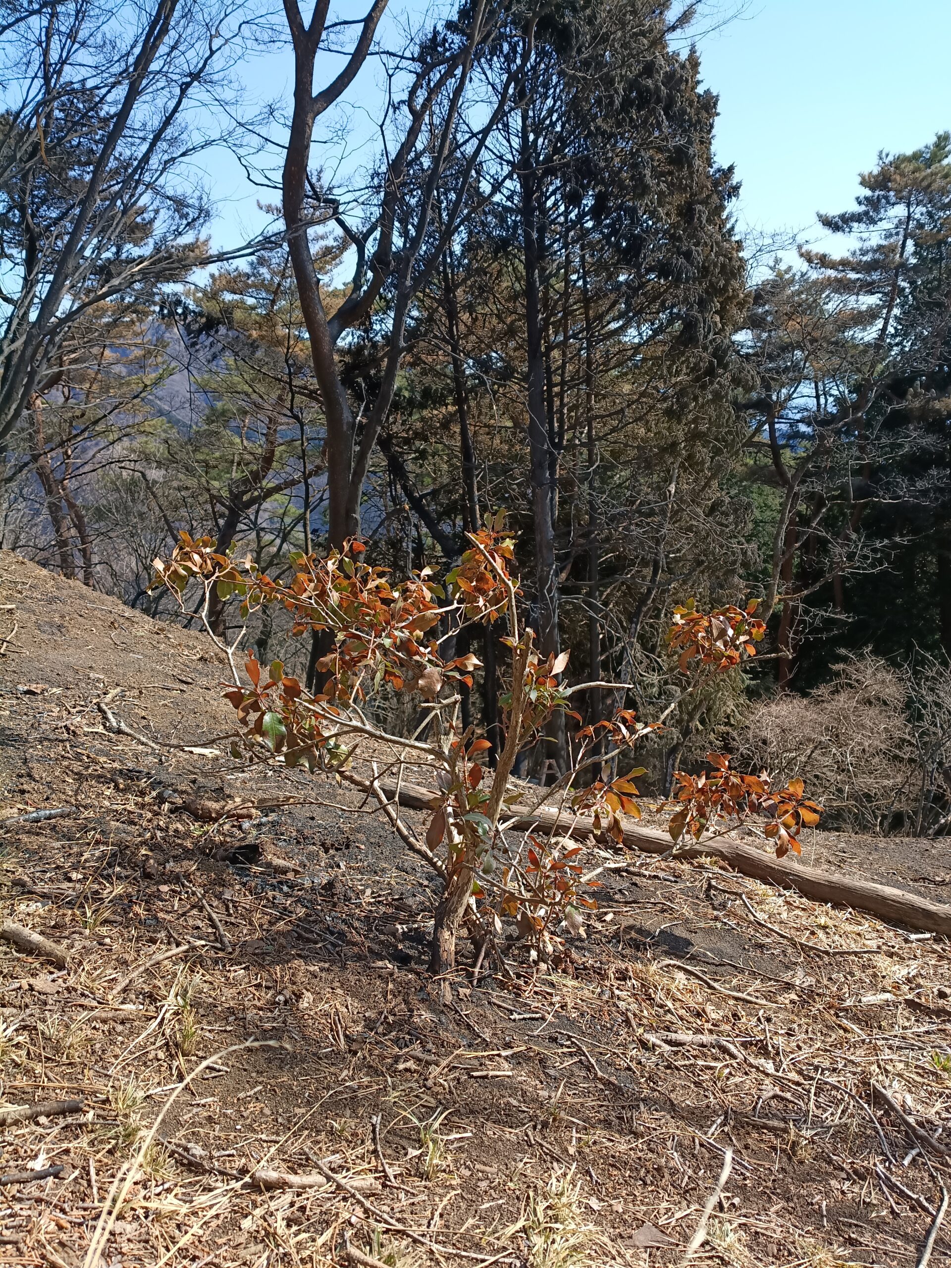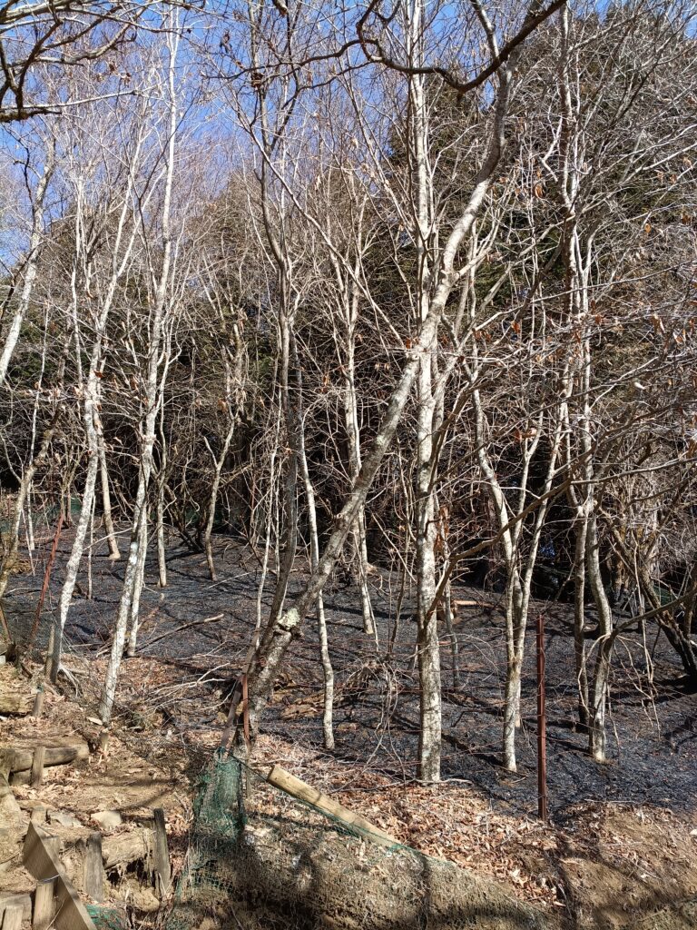 林床は黒焦げですが、高木だけでなく低木も目立った被害は根元だけのように見えます。