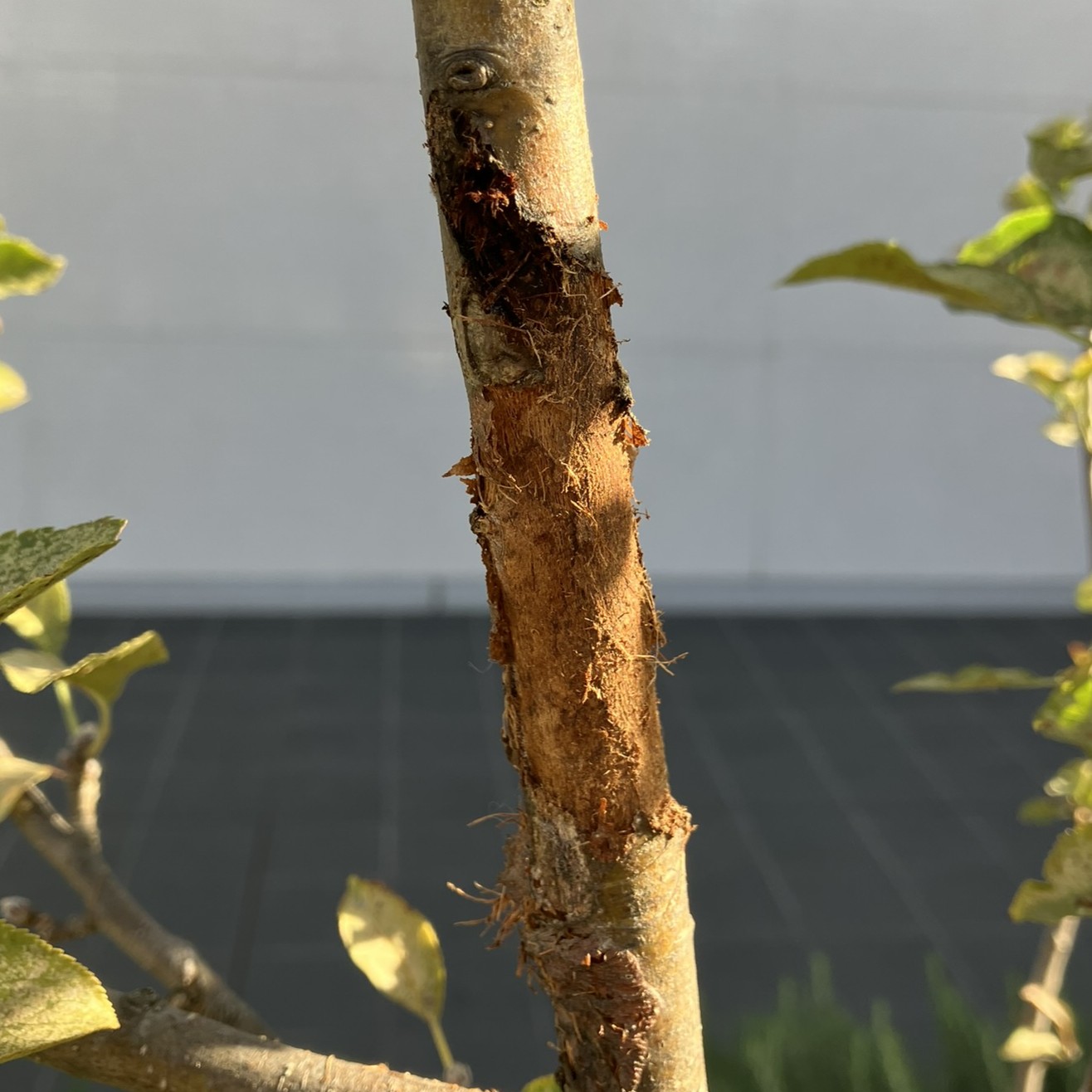 この特徴的な樹皮の異常でルリカミキリによる被害だと気づくことができます。